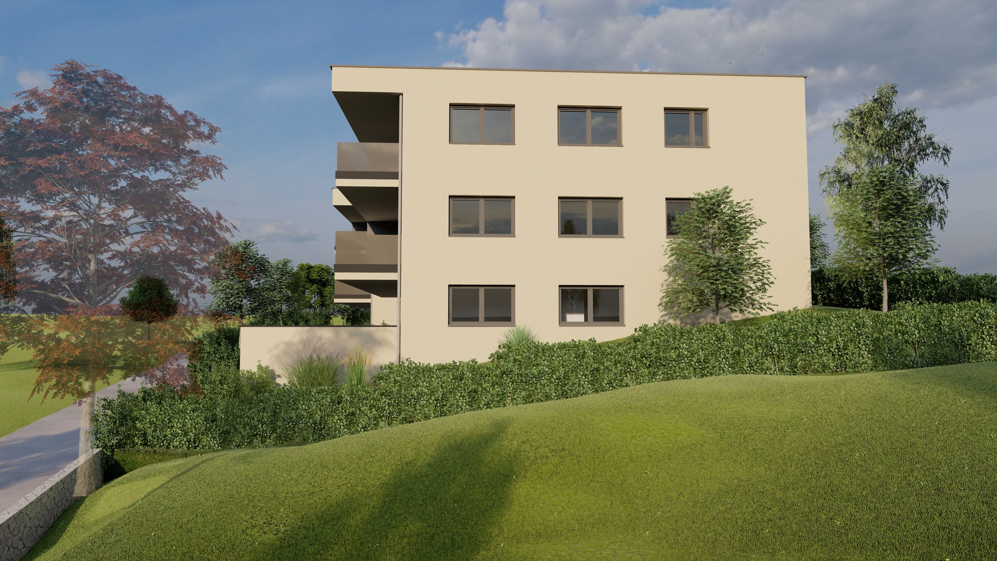 Alle Wohnungen haben überdachte Balkone und im Erdgeschoss eigene große Gärten mit Terrassen.